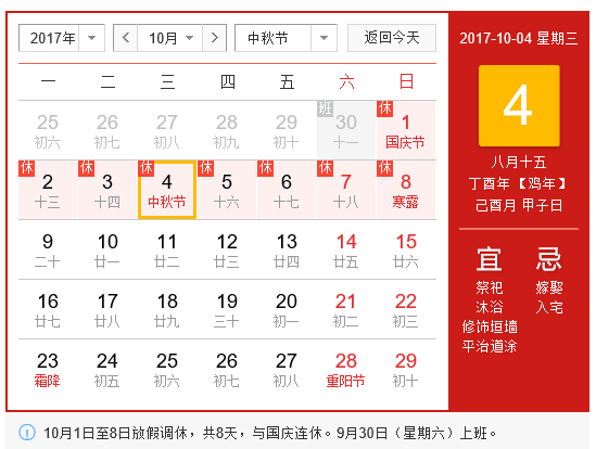 2017年中秋節(jié)是10月4日(星期三),故而與國慶節(jié)連休放假共8天(10月1日-10月8日)。9月30日(星期六)上班。