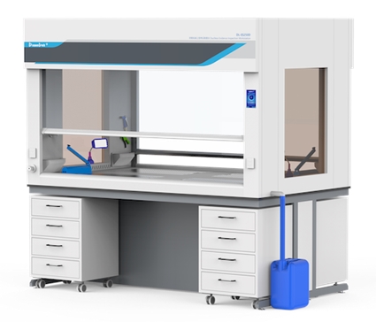君勒鉑?(DreamLab?)DL-FHDU系列桌上型下排風雙面無管凈氣型通風柜,專為配合中央實驗臺上進行的實驗而研制,通過內置的過濾系統(tǒng)而不是復雜昂貴的通風管道和廢氣處理系統(tǒng)為操作人員提供化學氣體或粉塵防護。操作人員可方便地使用整個桌面的任何區(qū)域。采用先進觸控技術的DLTouch自動安全控制器,提供了極易操控的系統(tǒng)界面,確保通風柜一直在安全可靠的狀態(tài)下運行。該通風柜帶有附加臺面下雙層箱式集氣通道,集氣箱上層布置有可移動下向集氣口,工作區(qū)產生的廢氣和粉塵通過側面排風格柵和臺面內集氣口送往頂部的過濾系統(tǒng)處理。桌上型下排風雙面無管通風柜的長寬高各個尺寸都可根據(jù)中央臺的尺寸特別定制,并可選配各種專用功能附件(如塑封機、標簽機等)。