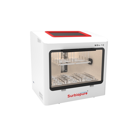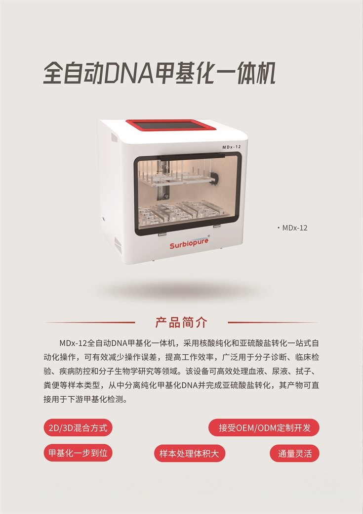 MDx-12全自動DNA甲基化一體機,采用核酸純化和亞硫酸鹽轉化一站式自動化操作,可有效減少操作誤差,提高工作效率,廣泛用于分子診斷、臨床檢驗、疾病防控和分子生物學研究等領域。該設備可高效處理血液、尿液、拭子、糞便等樣本類型,從中分離純化甲基化DNA并完成亞硫酸鹽轉化,其產物可直接用于下游甲基化檢測。