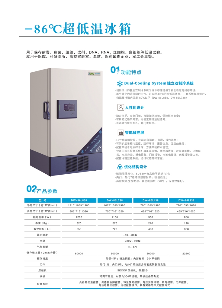 -86°C超低溫冰箱用于保存病毒、病菌、組織、試劑、DNA、RNA、紅細胞、自細胞等低溫試驗等。 應用于醫院、科研院所、高校實驗室、血站、醫藥試劑企業、軍工企業等。