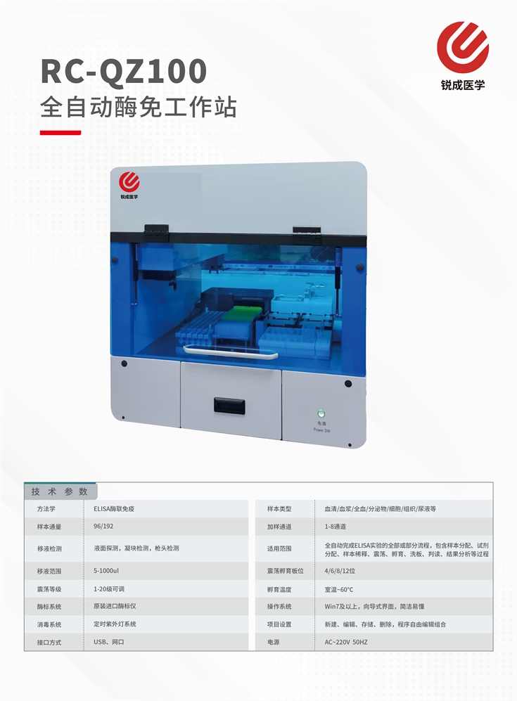 RC-QZ100全自動(dòng)酶免工作站適用范圍:全自動(dòng)完成ELISA實(shí)驗(yàn)的全部或部分流程,包含樣本分配、試劑分配、樣本稀釋、震蕩、孵育、洗板、判讀、結(jié)果分析等過程