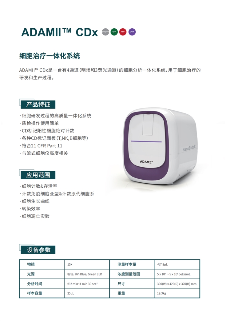 ADAMII?CDx是一臺(tái)有4通道(明場(chǎng)和3熒光通道)的細(xì)胞分析一體化系統(tǒng),用于細(xì)胞治療的研發(fā)和生產(chǎn)過(guò)程。