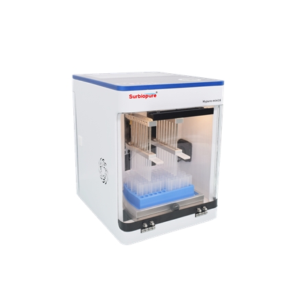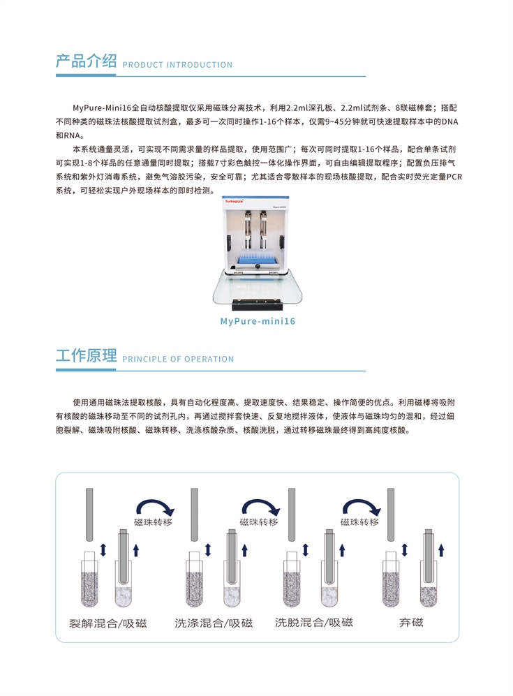 MyPure-Mini16全自動核酸提取儀采用磁珠分離技術,利用2.2ml深孔板、2.2ml試劑條、8聯磁棒套;搭配不同種類的磁珠法核酸提取試劑盒,最多可一次同時操作1-16個樣本,儀需9~45分鐘就可快速提取樣本中的DNA和RNA。 本系統通量靈活,可實現不同需求量的樣品提取,使用范圍廣;每次可同時提取1-16個樣品,配合單條試劑可實現1-8個樣品的任意通量同時提取;搭載7寸彩色觸控一體化操作界面,可自由編輯提取程序;配置負壓排氣系統和紫外燈消毒系統,避免氣溶膠污染,安全可靠;尤其適合零散樣本的現場核酸提取,配合實時熒光定量PCR系統,可輕松實現戶外現場樣本的即時檢測。